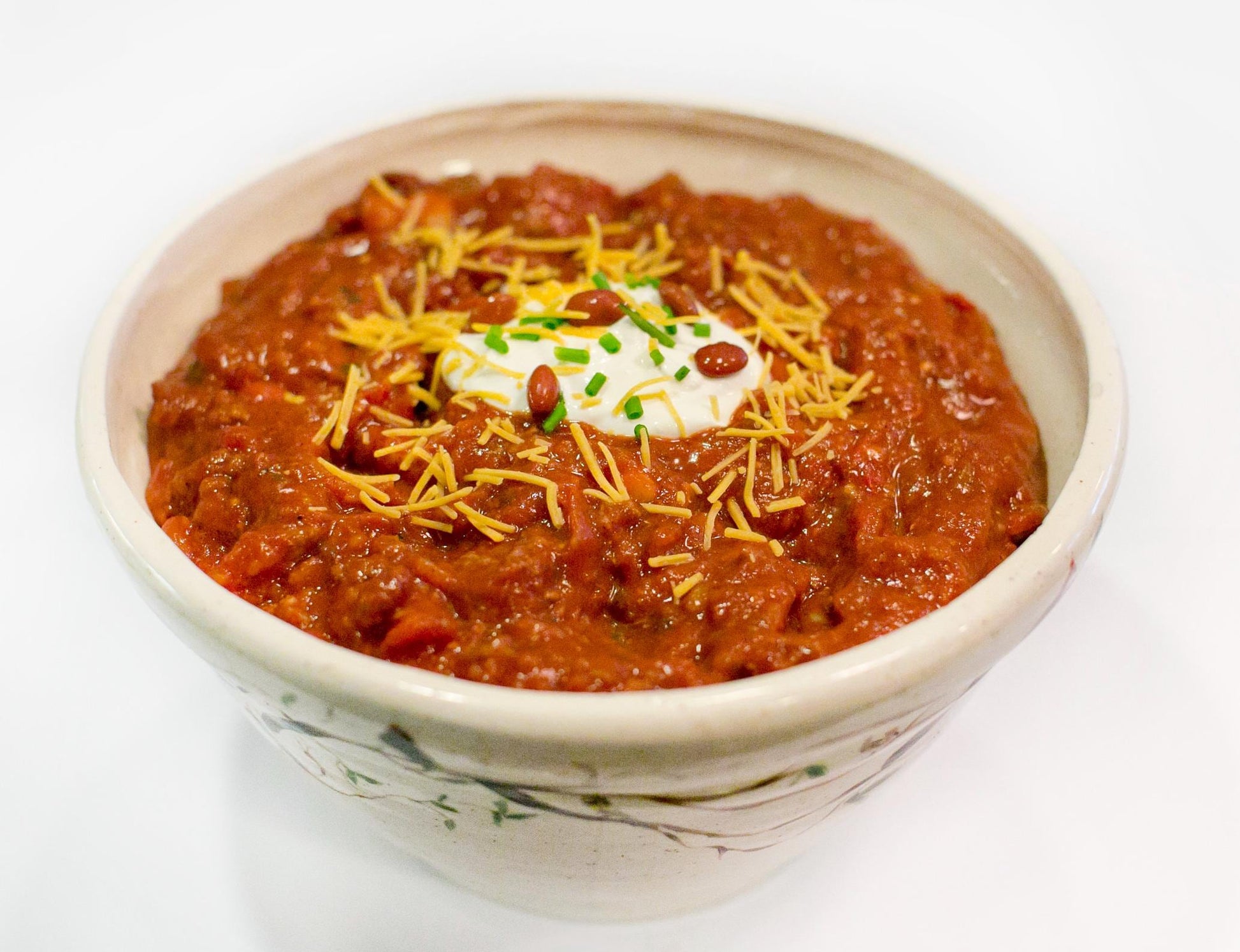 Brown 1 1/2 pounds of ground beef or pork sausage on low heat with 1 large chopped onion and 1 chopped green bell pepper until tender. Add 2- 28-Oz. cans of crushed tomatoes, all the spices, and 1-14-ounce can of fire-roasted diced tomatoes (with the liquid). Stir in 1 can of rinsed kidney beans and 2 cans of chili beans. Simmer on low for at least one hour. If desired, add tomato juice to thin the mixture.